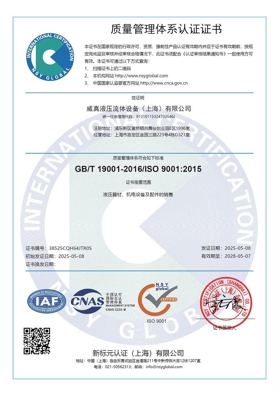 威真液壓流體設(shè)備(上海)有限公司是專業(yè)生產(chǎn)和經(jīng)營各種液壓膠管總成、液壓接頭、不銹鋼流體連接件、精密鋼管、球閥、法蘭及其它液壓附件的企業(yè),公司自創(chuàng)立以來一直致力為客戶提供完整的液壓、流體解決方案、努力打造“華東最大流體連接件超市”;始終堅(jiān)持“客戶至上、技術(shù)爭先、求真務(wù)實(shí)、揚(yáng)我國威”的企業(yè)宗旨。同時(shí)我們還是RYCO(澳大利亞萊科)品牌液壓軟管的授權(quán)代理商。我公司總部位于國際金融中心—上海,多年的液壓管件研發(fā)與生產(chǎn)經(jīng)驗(yàn)、專業(yè)的技術(shù)與服務(wù)隊(duì)伍為威真液壓打造行業(yè)一流企業(yè)提供了有力保障。目前我們已經(jīng)通過ISO 9001:2015/ GB/T 19001-2016 質(zhì)量體系認(rèn)證,而我們的產(chǎn)品全部按照DIN2353、ISO8434、SAEJ514等國際質(zhì)量體系標(biāo)準(zhǔn)進(jìn)行設(shè)計(jì)、生產(chǎn)、檢測。我們重視產(chǎn)品質(zhì)量,所以威真液壓今天已經(jīng)成為業(yè)界成長飛快的公司,盡管如此,我們?nèi)砸砸涣鞯钠焚|(zhì)和良好的交貨能力為客戶提供細(xì)致入微的服務(wù)。